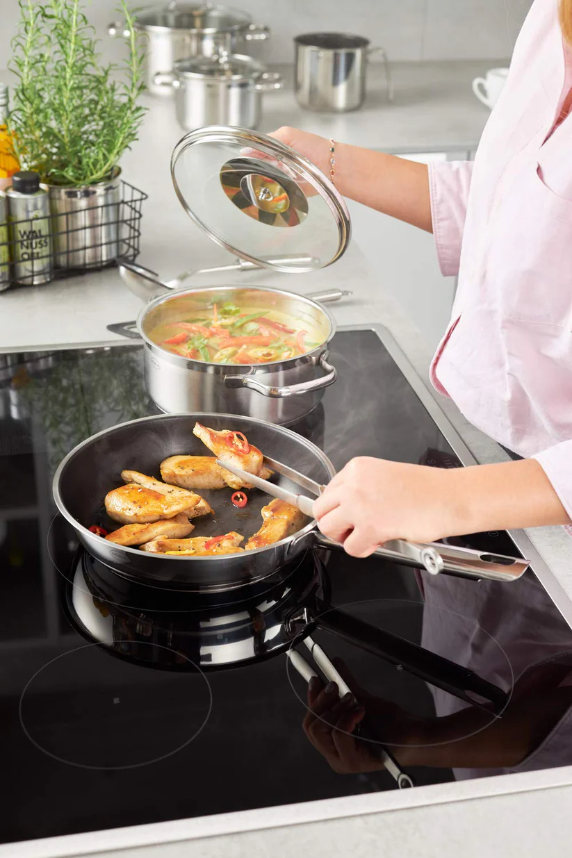 Das gesamte Set ist für alle Herdarten geeignet, einschließlich Induktion, Gas, Elektro und Glaskeramik, sowie backofengeeignet (ohne Glasdeckel). Zudem ist es vollständig spülmaschinengeeignet, was den Küchenalltag besonders komfortabel macht.